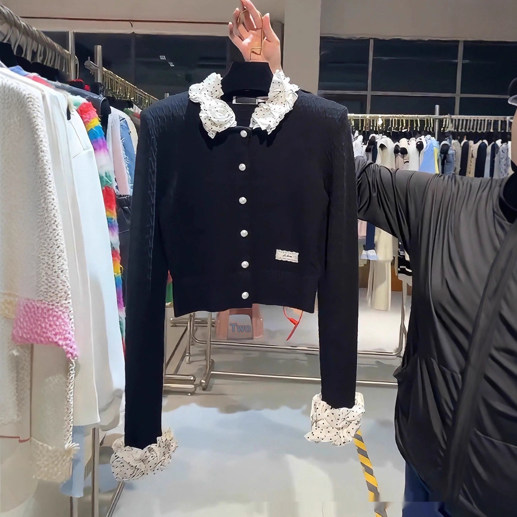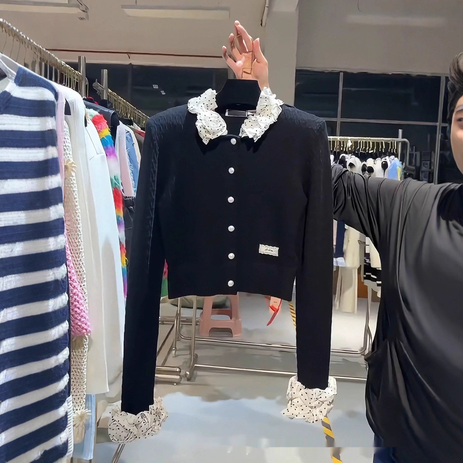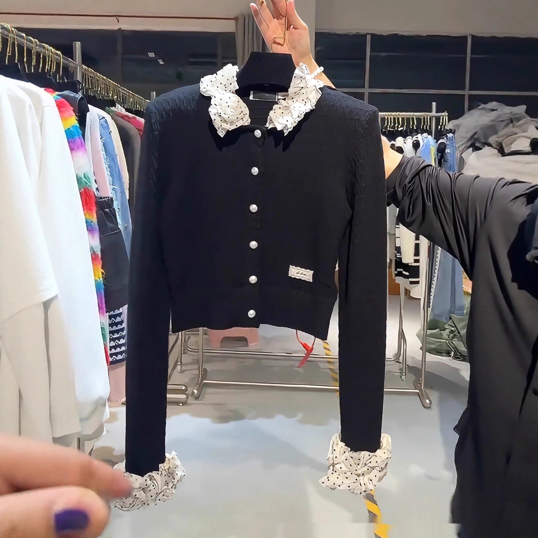 Women beaded polka dot patchwork short top with stylish autumn design. Elegant fashion blouse featuring decorative bead details and modern patchwork style. Perfect trendy top for casual wear, parties, and seasonal outfits.